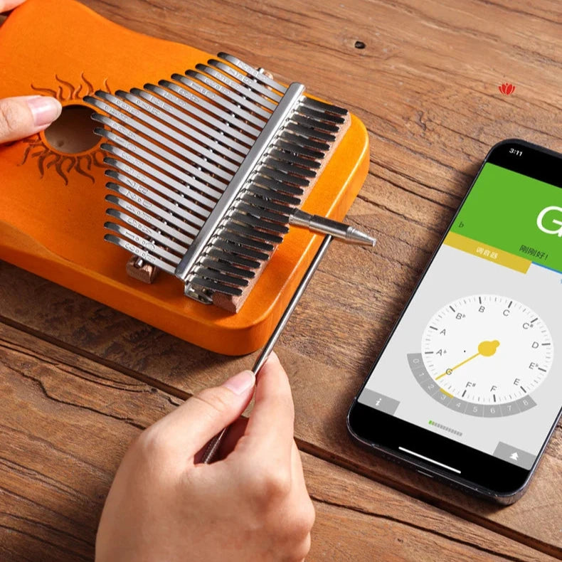 Every Kalimba Music of the Sun™ is tuned and tested well before shipped. To keep your thumb piano sounding good, learning to tune it is the most important and easy thing. 1. Download the tune APP. ( IOS: Instuner, Android: gStrings) 2. Tune with the hammer.